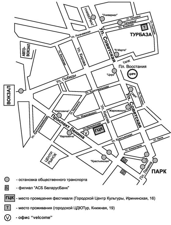 От ж/д вокзала: троллейбусами №: 1, 5, 7, 7а, 16; автобусами № 1, 3, 4, 11, 20 - 1 (одну) остановку, т.е. выйти на остановке "ул. Карповича". Пройти по ходу транспорта 10-15 м до перехода и перейти на другую сторону пр. Ленина к офису VELCOM, который находится на углу пр-та Ленина и ул. Ирининской. Далее пройти по ул. Ирининской около 100 м до Городского центра культуры, который будет справа.